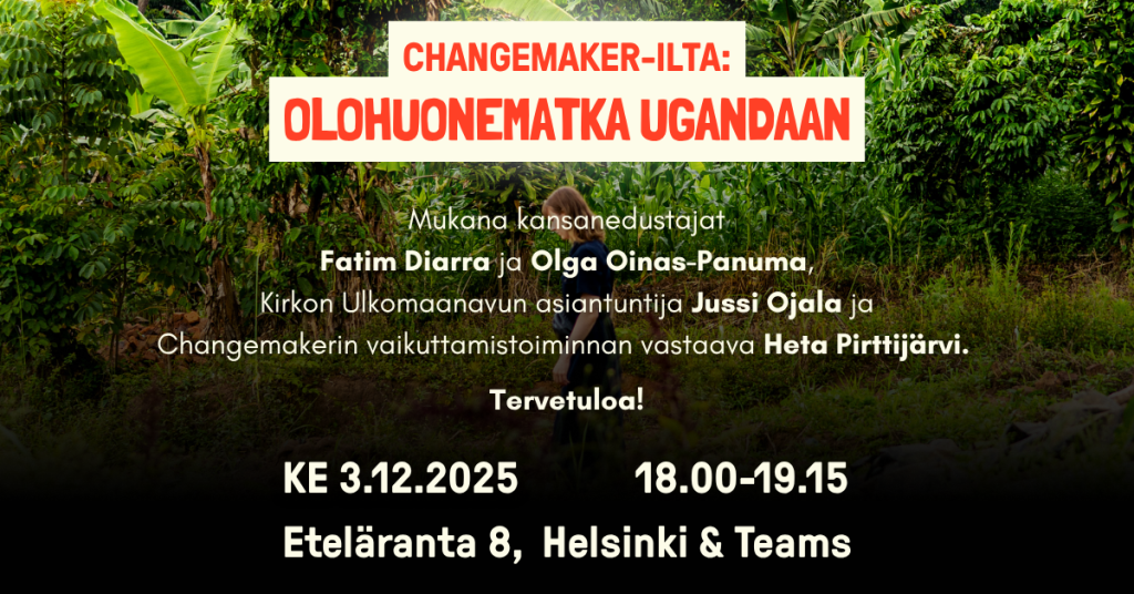 Olohuonematka Ugandaan vie näiden kysymysten pariin yhdessä kansanedustajien Fatim Diarran, Olga Oinas-Panuman, sekä Kirkon Ulkomaanavun ja Changemakerin kanssa.