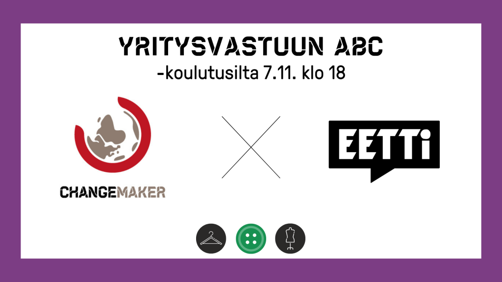 Changemakerin ja Eetin Yritysvastuun ABC-koulutuksessa pääset pohtimaan mm. näitä kysymyksiä ja opit vaeltamaan paremmin yritysten vastuullisuusväitteiden viidakossa. Koulutuksessa opit miten ihmisoikeudet, ilmastonmuutos ja luontokato linkittyvät yritysten toimintaan meillä ja muualla ja miksi yritysvastuuseen on hyvä kiinnittää huomiota.