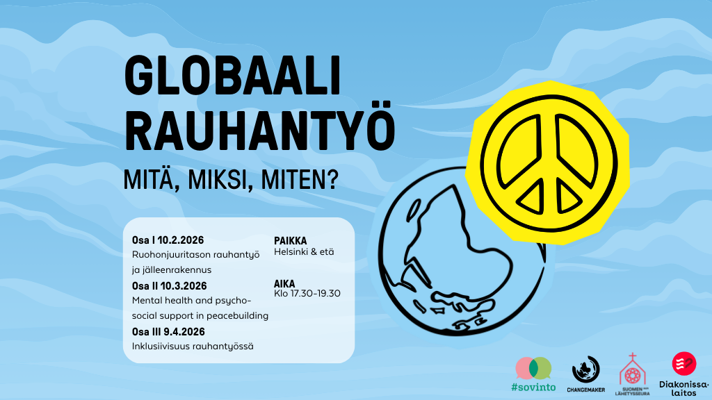 Tänä keväänä sukellamme globaalin rauhantyön ytimeen kolmiosaisessa koulutussarjassa Globaali rauhantyö: mitä, miksi, miten? Koulutussarjan aikana pääset tutustumaan ruohonjuuritason rauhantyöhön, jälleenrakentamiseen, psykososiaaliseen tukeen sekä inklusiivisuuteen osana rauhantyötä Kirkon Ulkomaanavun, Diakonissalaitoksen ja Suomen Lähetysseuran asiantuntijoiden johdolla. Kuulet kiinnostavia esimerkkejä ympäri maailmaa tehtävästä rauhantyöstä ja pääset keskustelemaan koulutusten teemoista rauhantyön asiantuntijoiden kanssa.