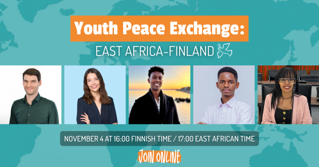 The Youth Peace Exchange: East Africa – Finland is an event for young people to voice their perspectives and discuss the role of digital spaces in peace and security. The webinar aims to connect young people from East Africa and Finland, provide a safe space for dialogue, and strengthen youth participation in the field of peacebuilding.